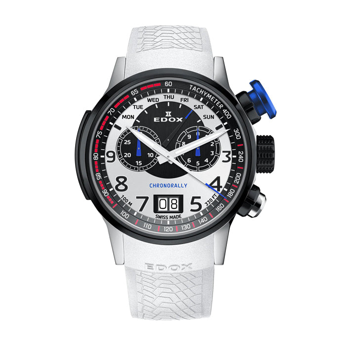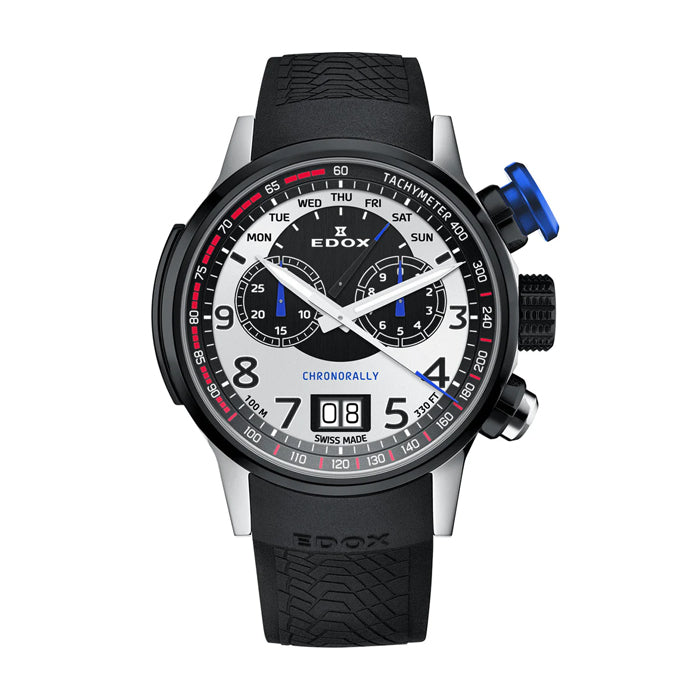 CHRONORALLY - In 2008, Edox presented the Chronorally, a revolutionary chronograph with new, sophisticated technical functions originally developed for rally drivers. The Chronorally features a unique design with the oversized start/stop pusher - quickly becoming a public favourite.