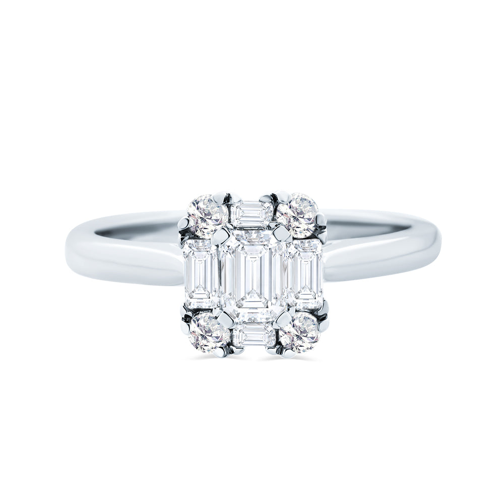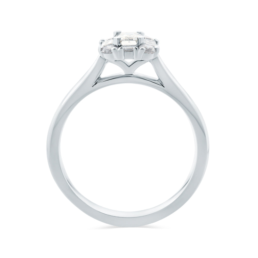 This ring is made from 18ct white gold. It features an emerald cut diamond in the centre in a four-claw setting that is surrounded by a halo of brilliant and baguette cut diamonds.