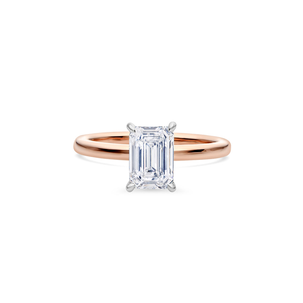 This ring is made from 9ct rose and 18ct white gold. It features a 1.5ct emerald cut LAB GROWN diamond in a four-talon claw setting made from white gold. The look of this ring is finished off with a fine, rounded, rose gold band.