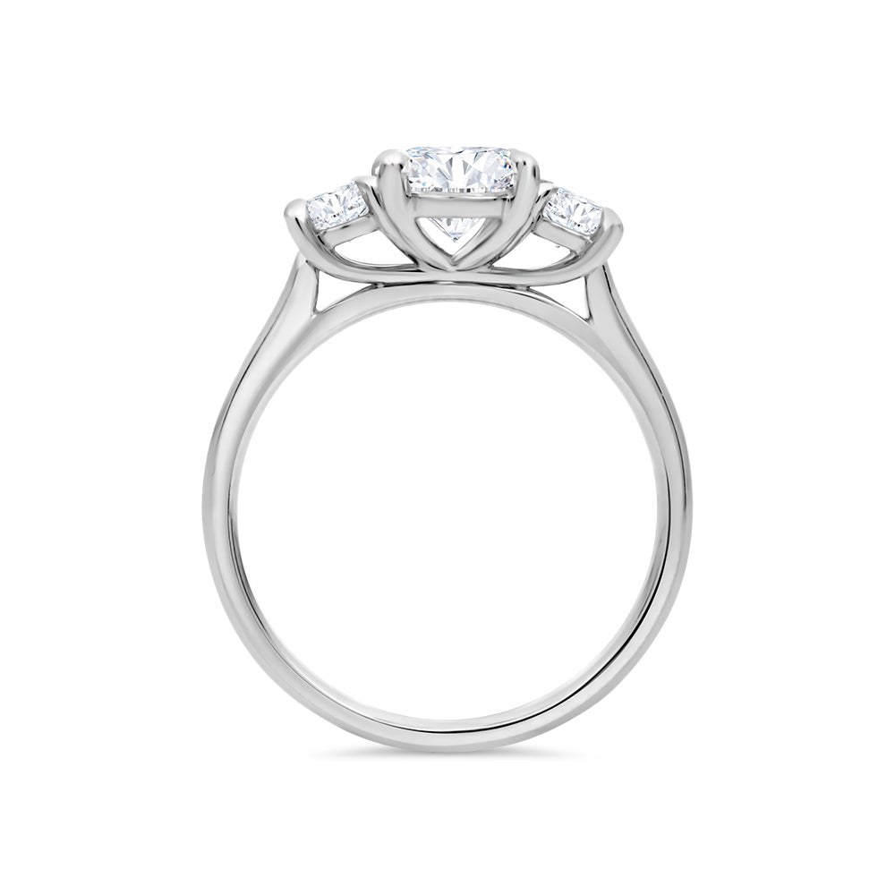 This ring is made from 18ct white gold, it features an oval cut LAB GROWN diamond in a four claw setting in the centre with round brilliant cut, LAB GROWN diamonds set on either side.