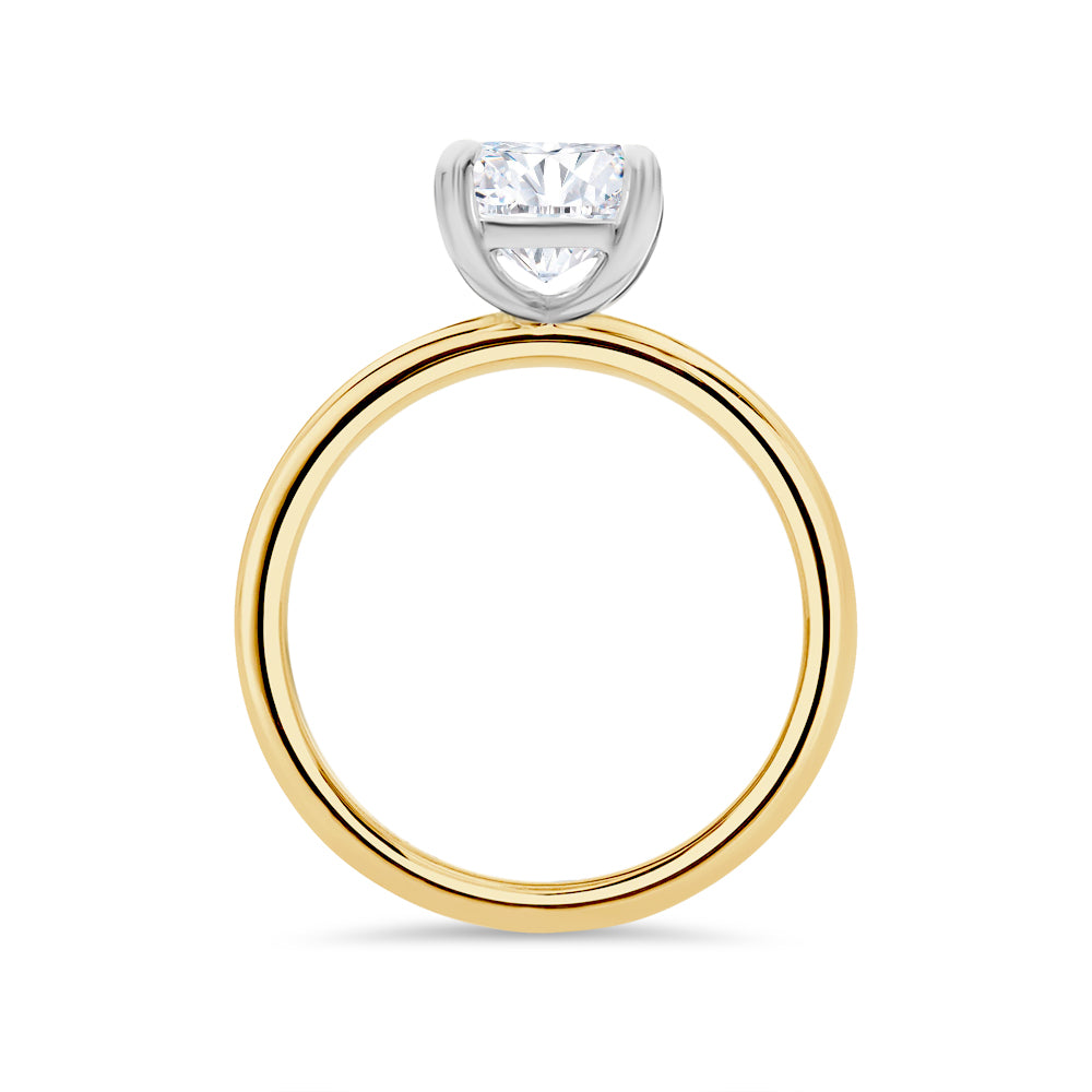 This solitaire ring is made from 18ct yellow and white gold. It features an emerald cut, LAB GROWN diamond in a white gold, four-claw setting. The look of this ring is finished off with a yellow gold band.