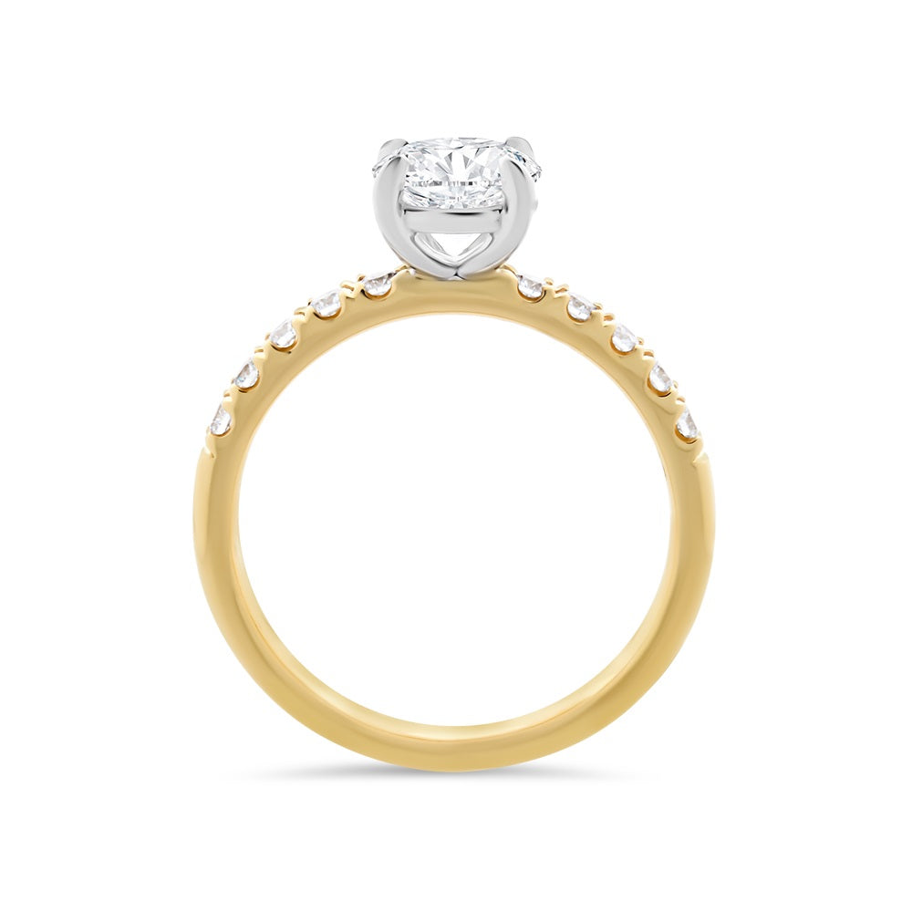 This ring is made from 18ct gold. It features a 1.01ct round brilliant cut LAB GROWN diamond in a white gold four-claw setting. The look of this ring is finished off with round brilliant cut LAB GROWN diamonds that are claw set in white gold and a yellow gold band.
