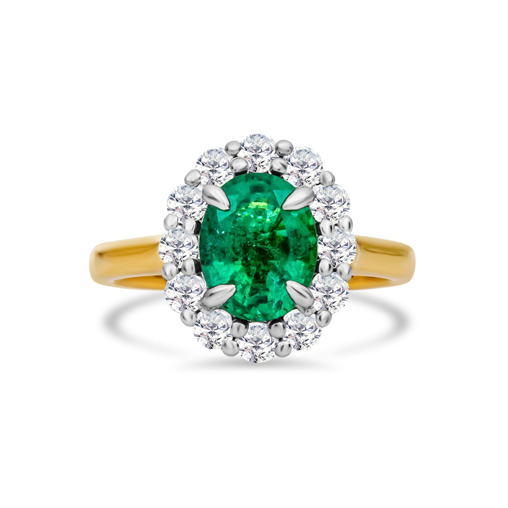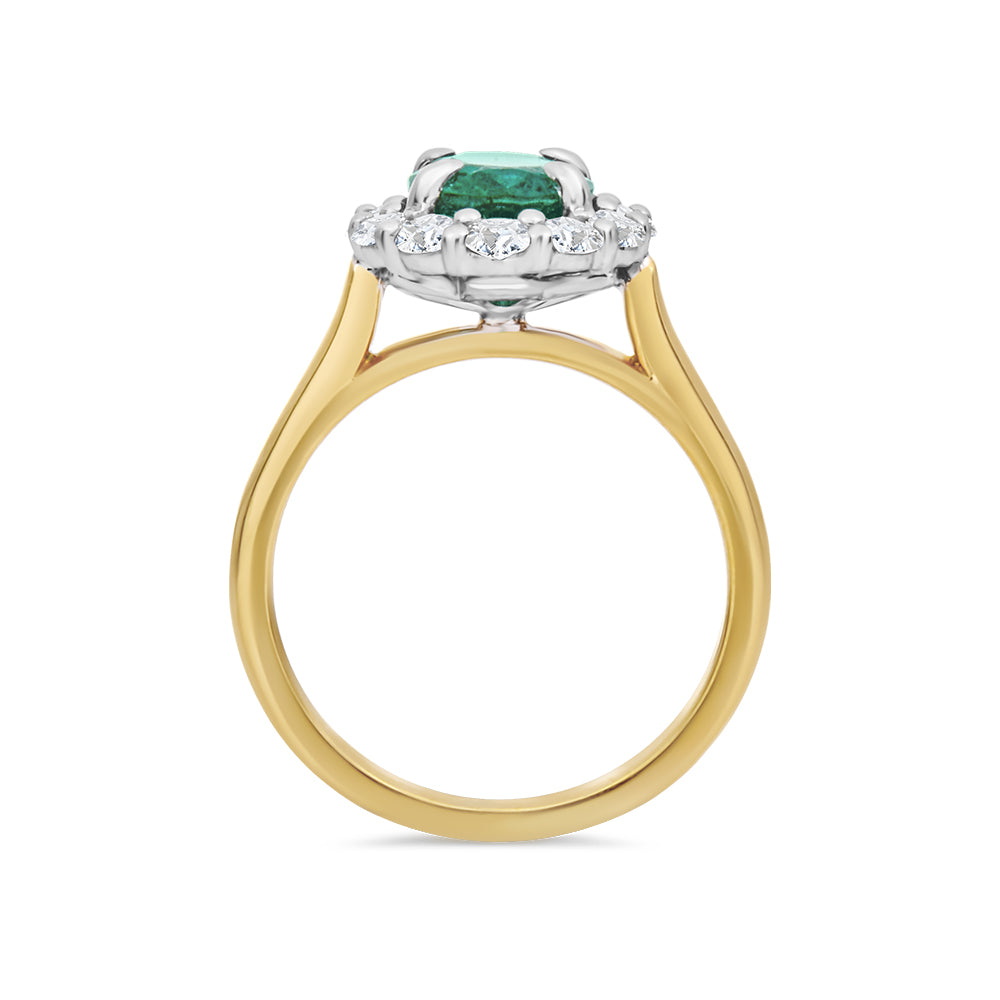 This ring is made from 18ct yellow and white gold. It features an oval cut, emerald in a four claw setting in the centre and is surrounded by a halo of round, brilliant cut diamonds, also claw set in white gold. The look of the ring is finished off with a yellow gold band.