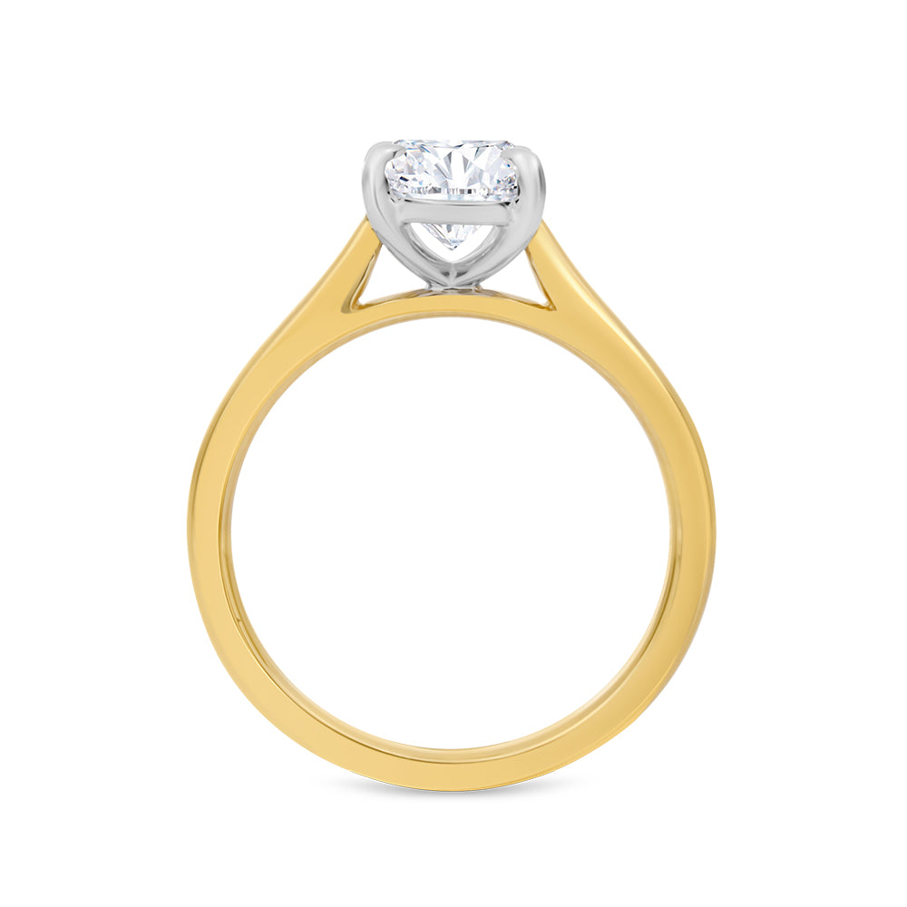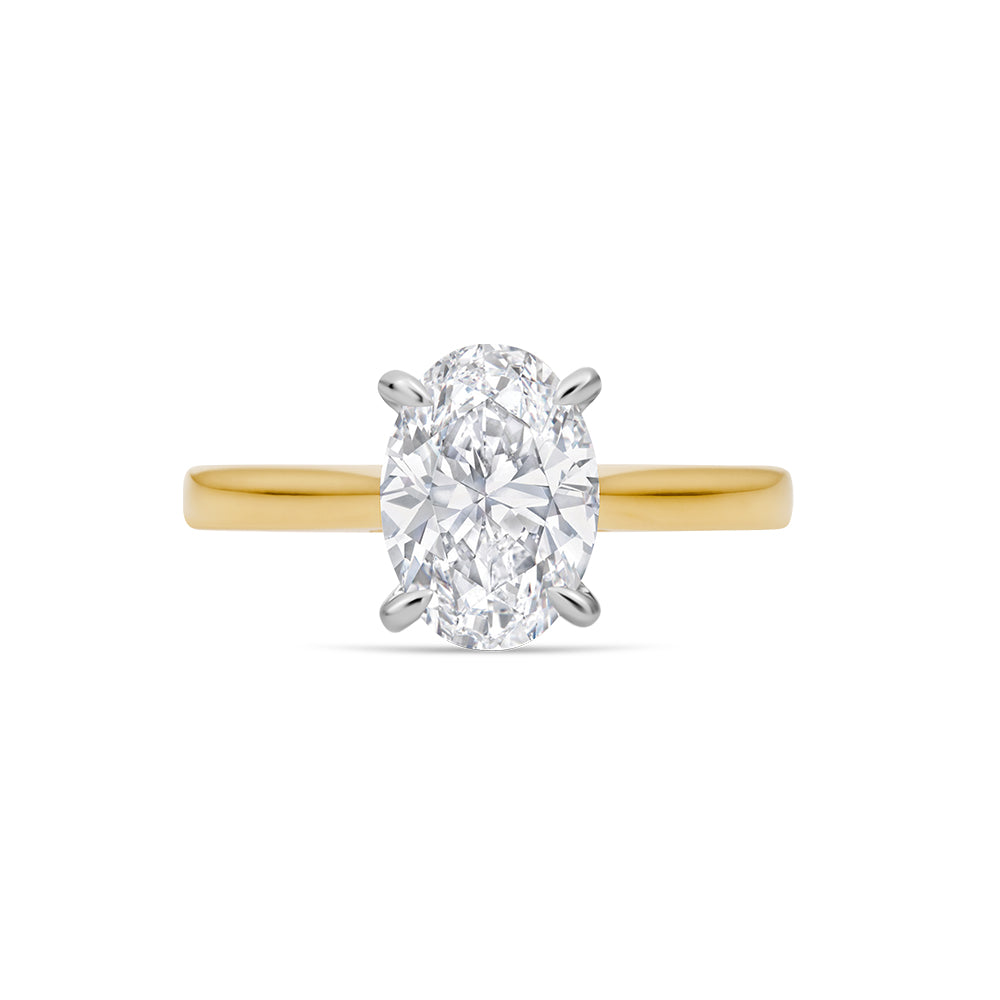 This ring is made from 18ct gold. It features a 2ct oval cut LAB GROWN diamond in a white gold four claw setting. The look of this ring is finished off with a yellow gold band.