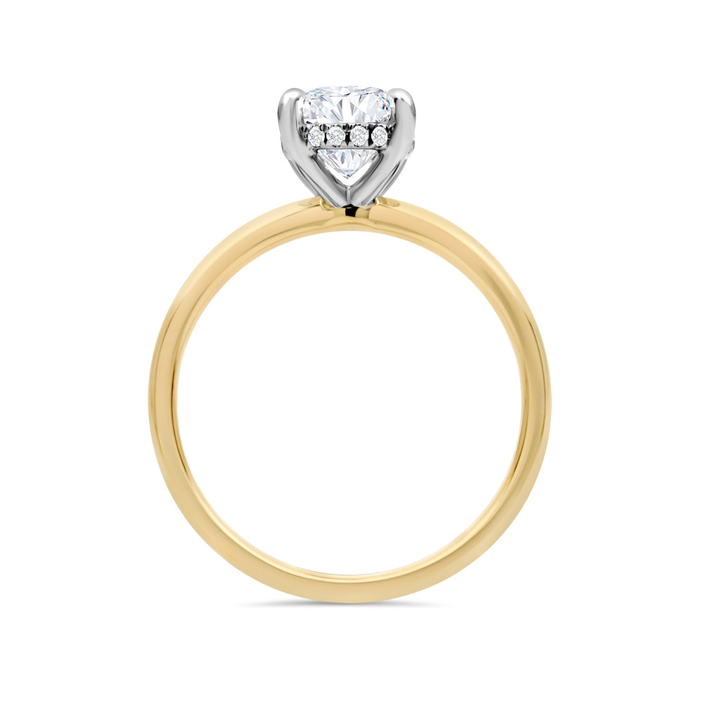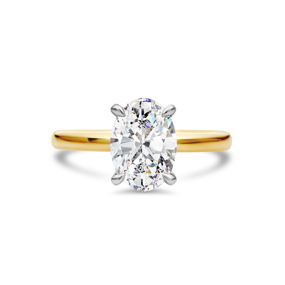 This ring is made from 18ct yellow and white gold, it features an oval cut, LAB GROWN diamond in a white gold, four-claw setting and features a hidden halo of claw set diamonds. The band of the ring is made from yellow gold.