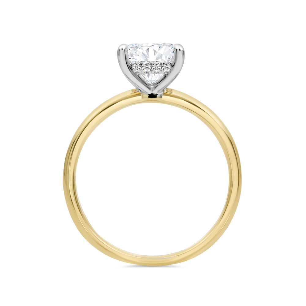 This ring is made from 18ct yellow and white gold, it features a princess cut, LAB GROWN diamond in a white gold, four-claw setting and features a hidden halo of claw set diamonds. The band of this ring is yellow gold.