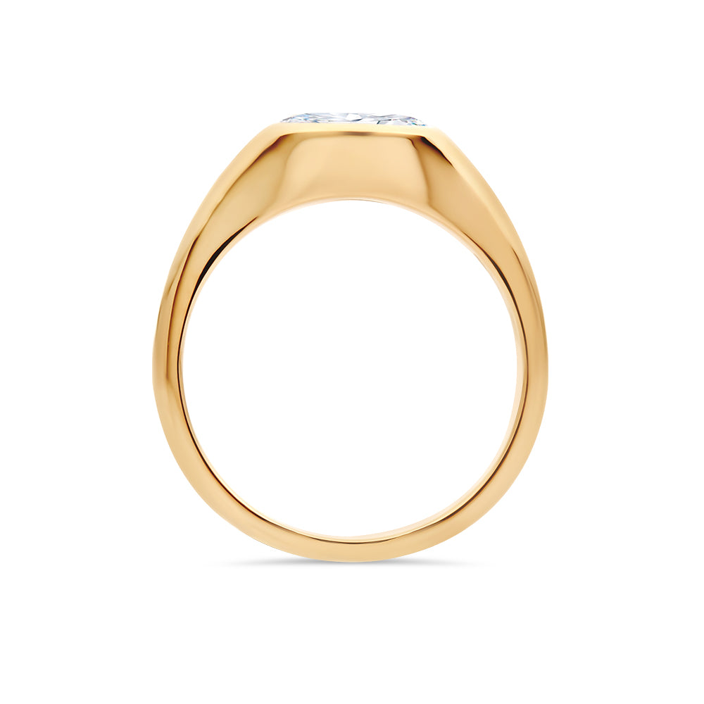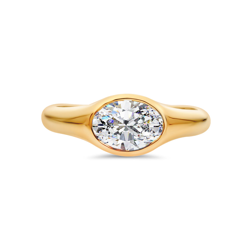 This ring is made from 18ct yellow gold. It features an oval cut, LAB GROWN diamond that is bezel set , east to west.