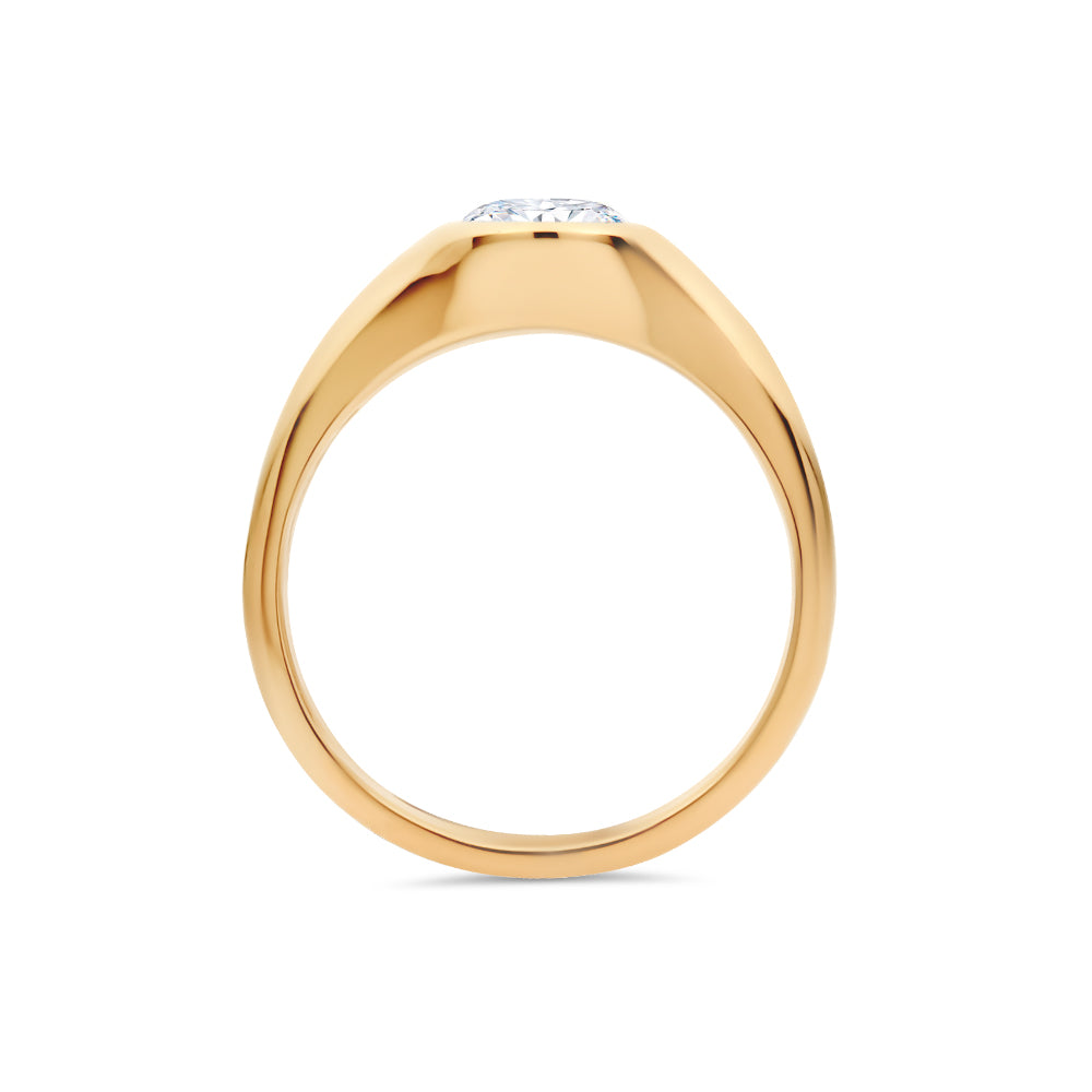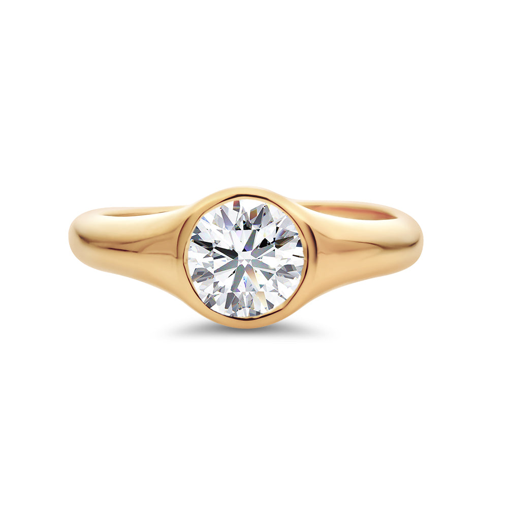 This ring is made from 18ct yellow gold. It features a round brilliant cut, lab grown diamond that is bezel set in the centre.