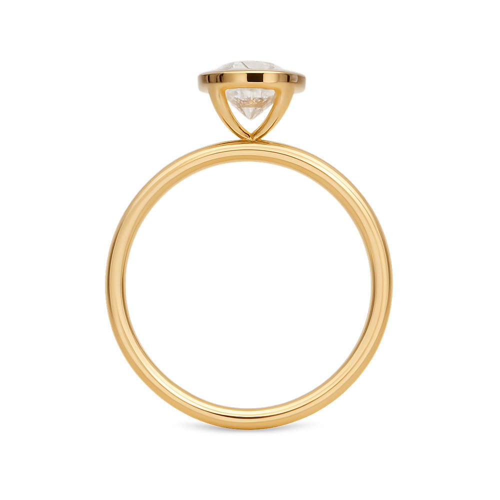 This ring is made from 18ct yellow gold. It features a 1.51ct Oval cut, LAB GROWN diamond in the centre in a bezel setting. The look of this ring is finished off with a fine, rounded band.