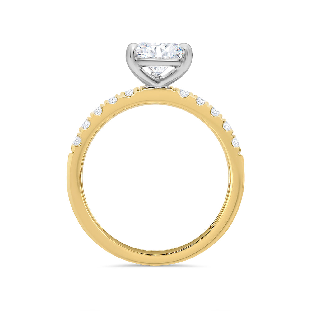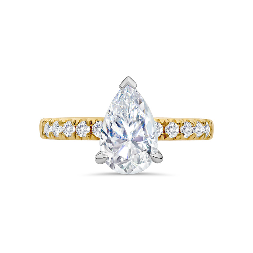 This ring is made from 18ct yellow and white gold, it features a LAB GROWN, pear cut diamond set into a white gold three-claw setting while the band of the ring is set with round brilliant cut diamonds.