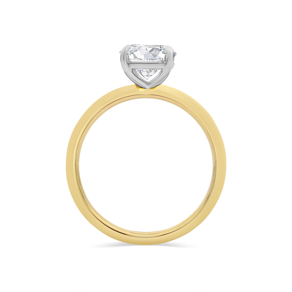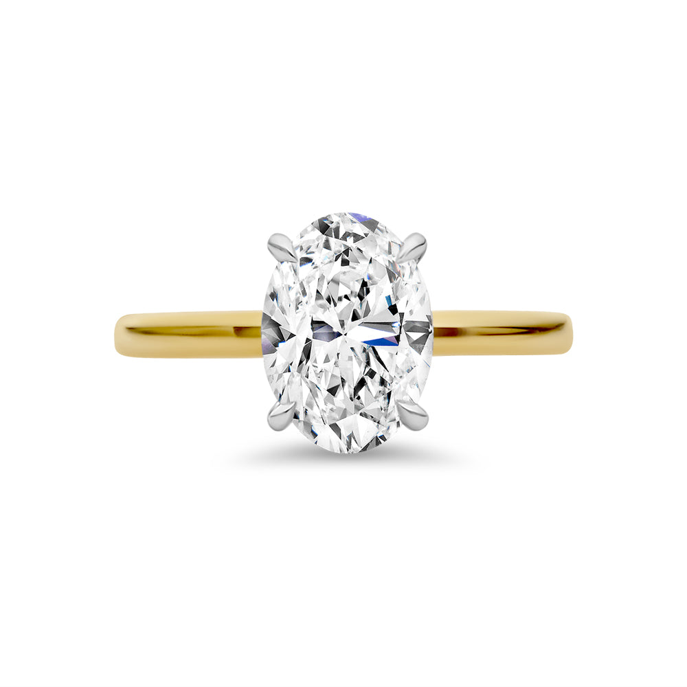 This solitaire ring is made from 18ct yellow and white gold. It features an oval cut, LAB GROWN diamond in a white gold, four-claw setting. The look of this ring is finished off with a yellow gold band.