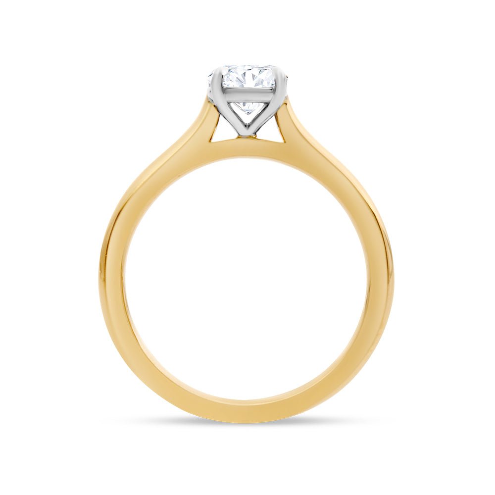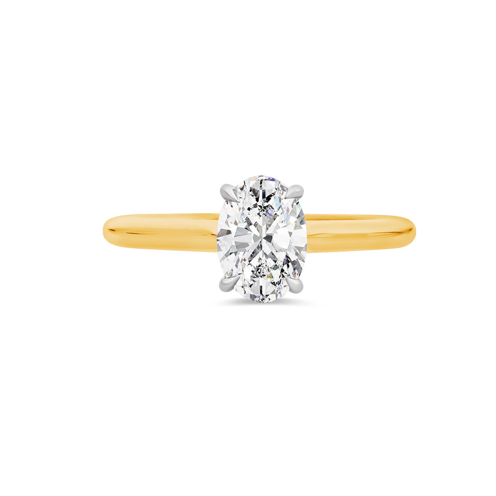 This solitaire ring is made from 18ct yellow and white gold. It features an oval cut, LAB GROWN diamond in a white gold, four-claw setting.  The look of this ring is finished off with a yellow gold band.