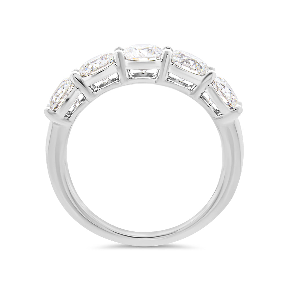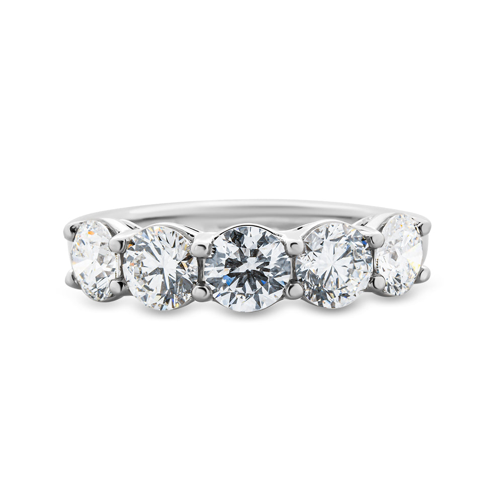This ring is made from 18ct white gold. It features 5 round brilliant cut lab grown diamonds, each set in a four-claw setting with a scalloped edge.