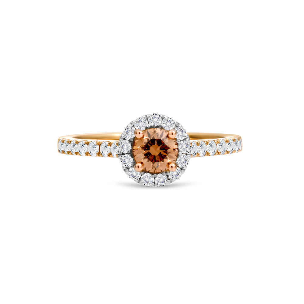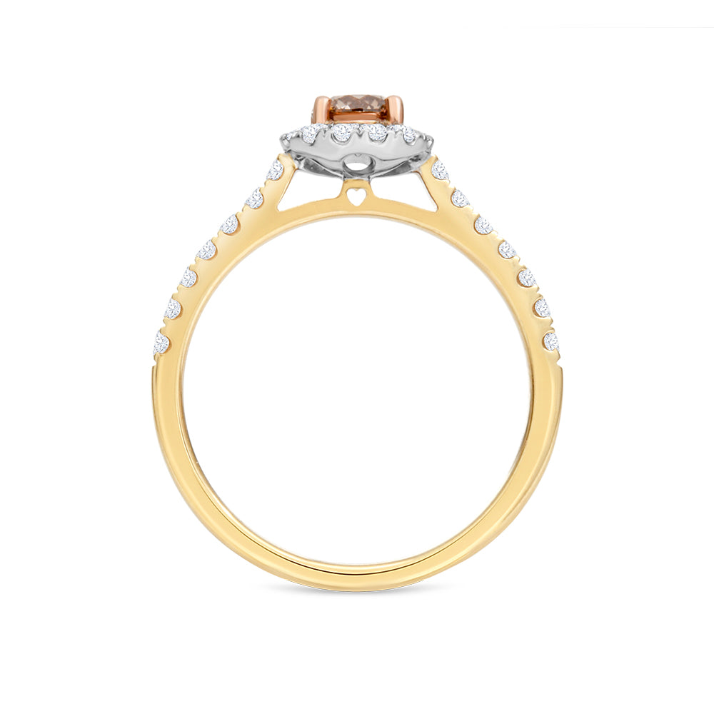 This ring is made from 9ct yellow, white and rose gold. It features a round brilliant cut, Australian chocolate diamond that is in a four claw, rose gold setting. The centre stone is surrounded by a halo  of round brilliant cut diamonds that are claw set in white gold. The look of this ring is finished off with round brilliant cut diamonds that are claw set into the yellow gold band.
