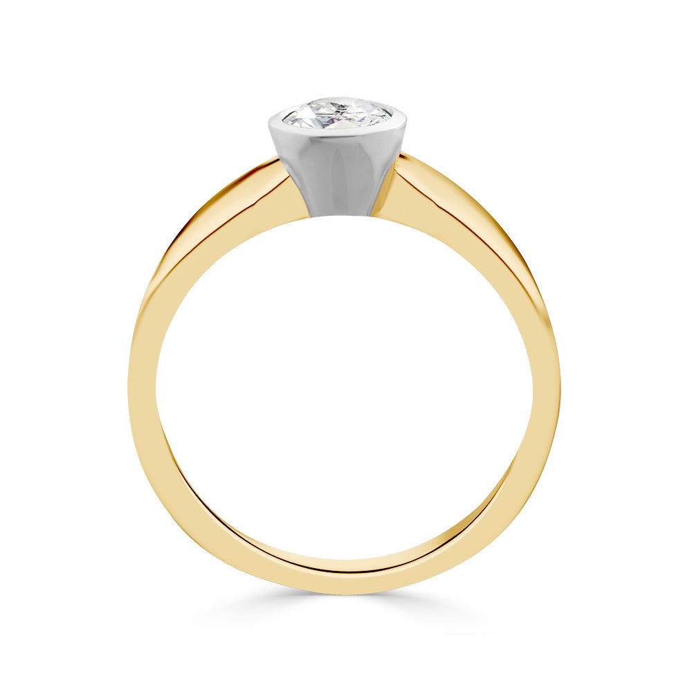 This ring is made from 18ct yellow and white gold. It features a 0.50ct round brilliant cut diamond in a white gold bezel setting. The band of this ring is 18ct yellow gold.