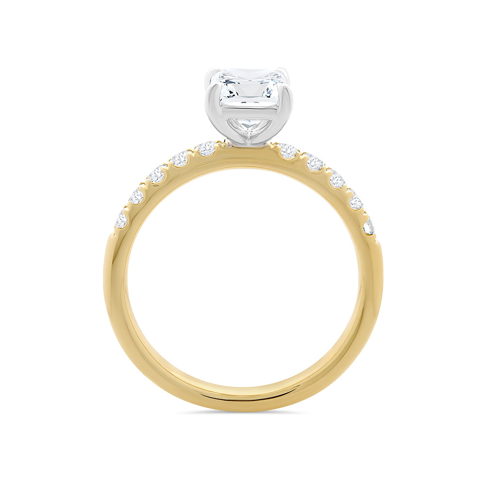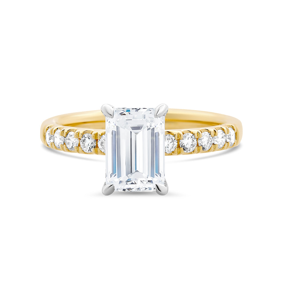 This ring is made from 18ct gold. It features a 1.5ct emerald cut LAB GROWN diamond in a white gold, four talon claw setting. The look of this ring is finished off with round brilliant cut lab grown shoulder diamonds that are claw set in the yellow gold band.