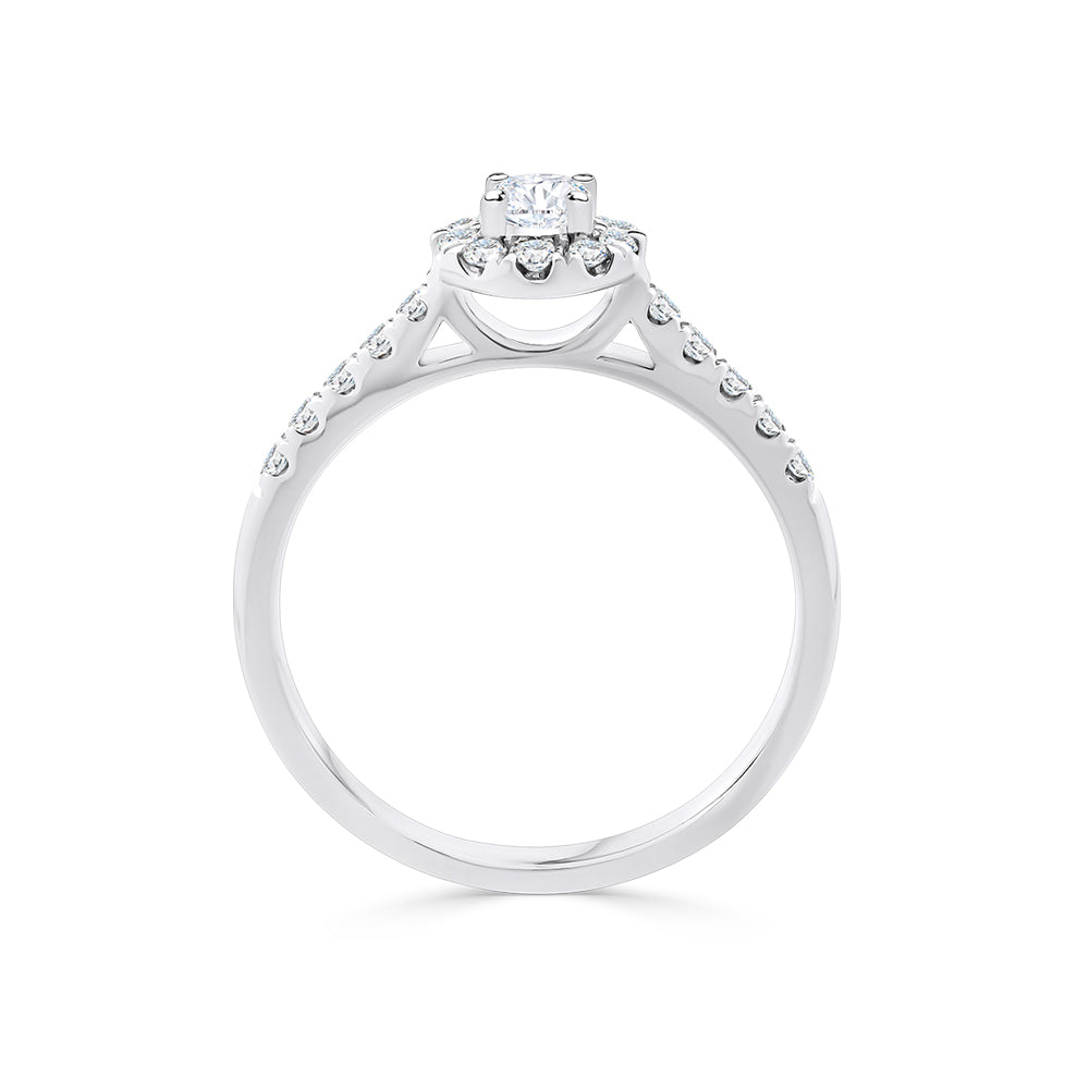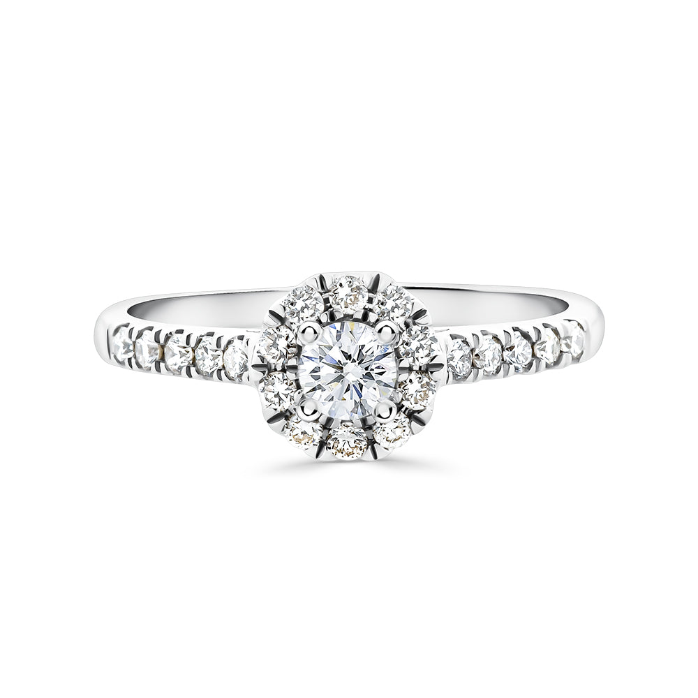 This ring is made from 9ct white gold. It features a round brilliant cut diamond in the centre in a four-claw setting that is surrounded by a halo of claw set diamonds. The claw set diamonds also run down the band of the ring.