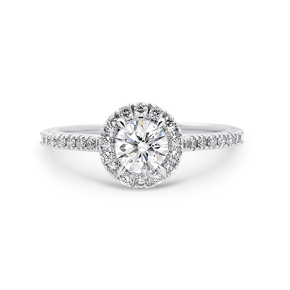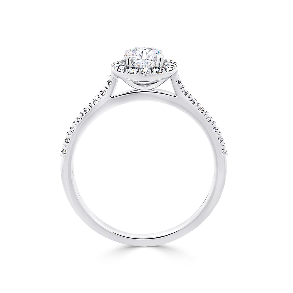 This ring is made from 18ct white gold. The ring features a 0.50ct round, brilliant cut diamond in the centre, set in a four-claw setting. The centre stone is surrounded by a halo of 14 smaller round brilliant cut diamonds, also claw set. The band of the ring is also claw set. This ring is designed to fit up against a straight wedding ring.