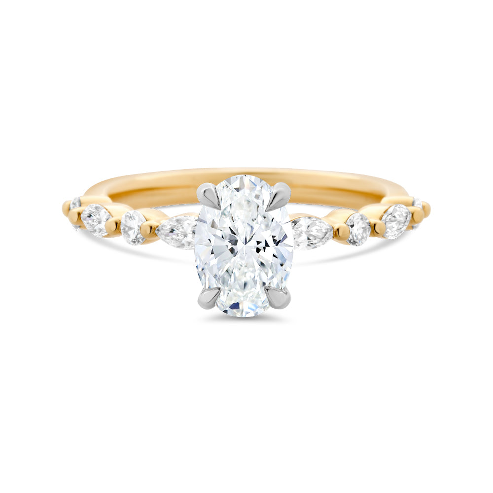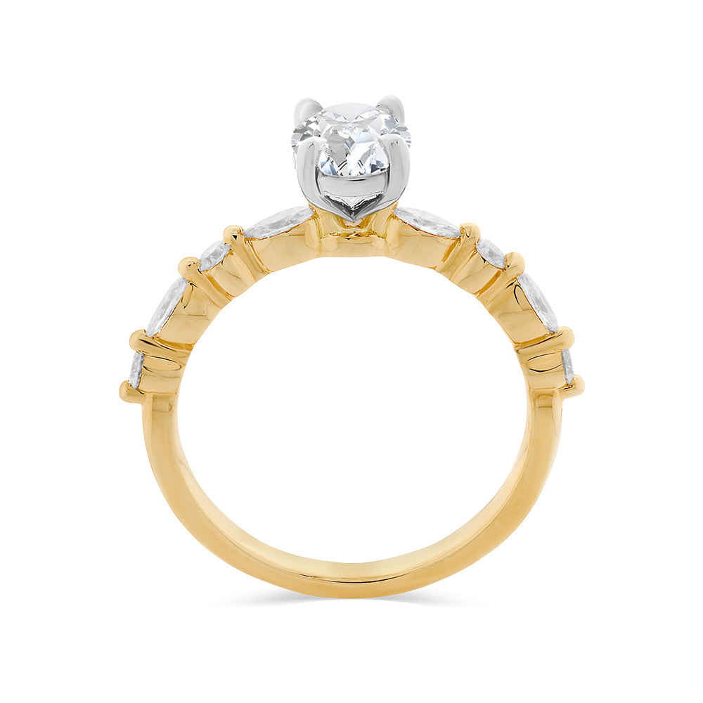 This ring is made from 18ct gold. It features a 1ct oval cut LAB GROWN diamond in a white gold, four talon claw setting. The look of this ring is finished off with alternating marquise and round brilliant cut lab grown shoulder diamonds that are claw set in the yellow gold band.