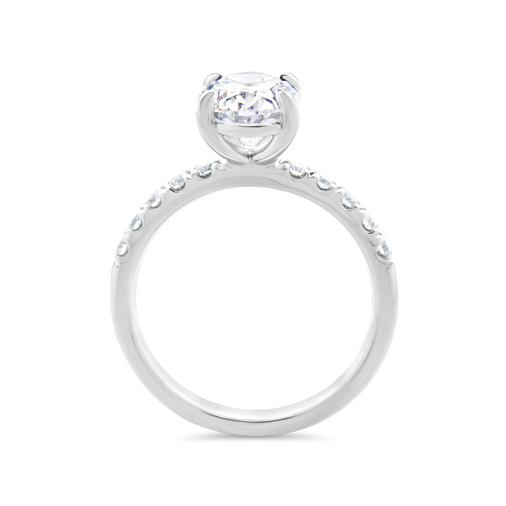 This ring is made from 18ct white gold. It features a 2ct oval cut LAB GROWN diamond in a white gold, four claw setting. The look of this ring is finished off with round brilliant cut LAB GROWN diamonds that are claw set into the band.