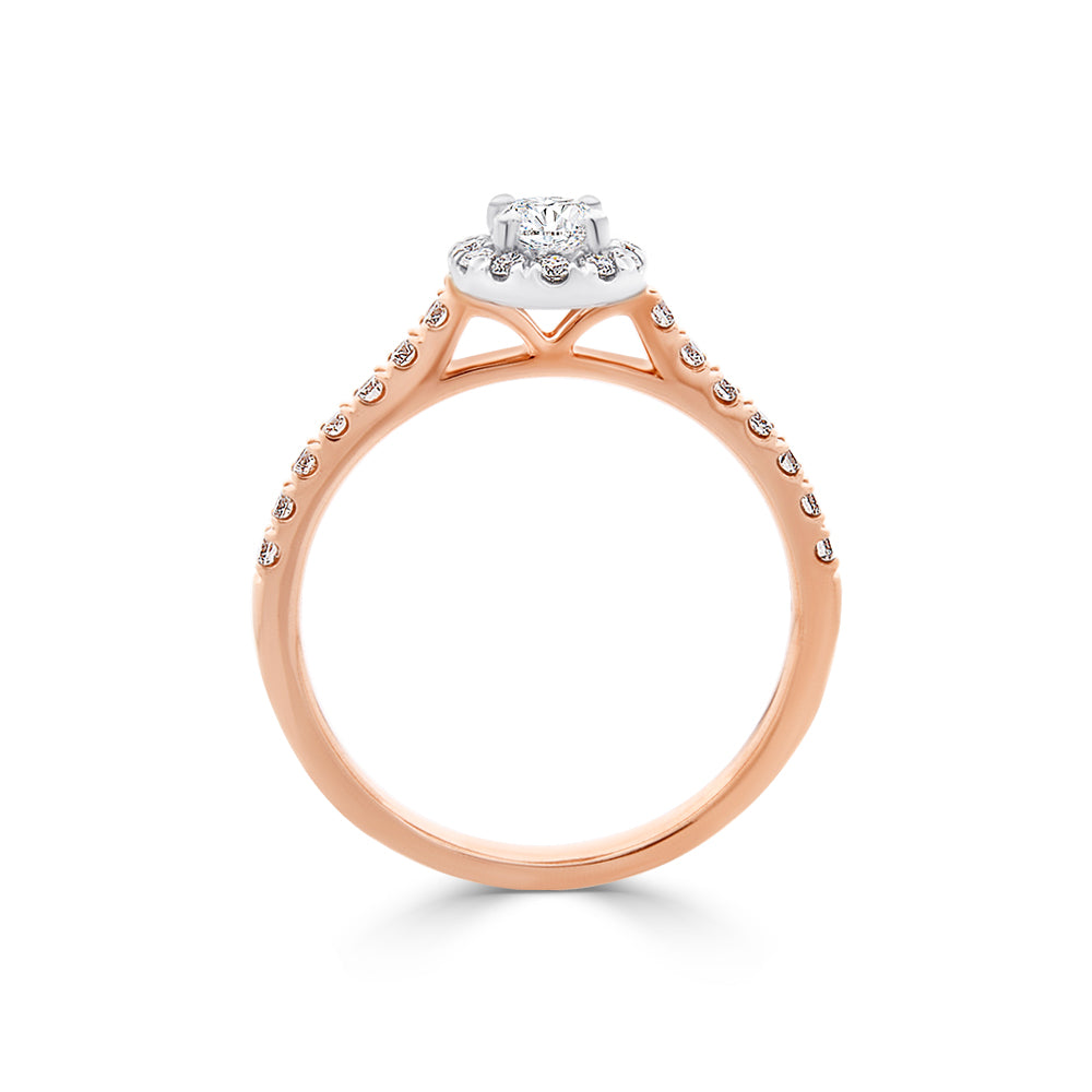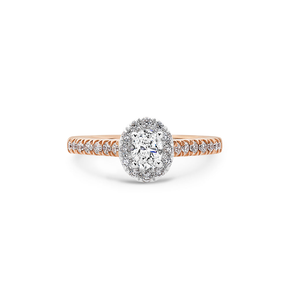This ring is made from 9ct white and rose gold. The ring features a 0.30ct oval cut diamond in a white gold, four-claw setting. The centre stone is then framed by a halo of small, round brilliant cut diamonds that are also claw set in white gold. The band of this ring is rose gold and it also has claw set, round brilliant cut diamonds. This ring is designed to fit up against a straight wedding ring.
