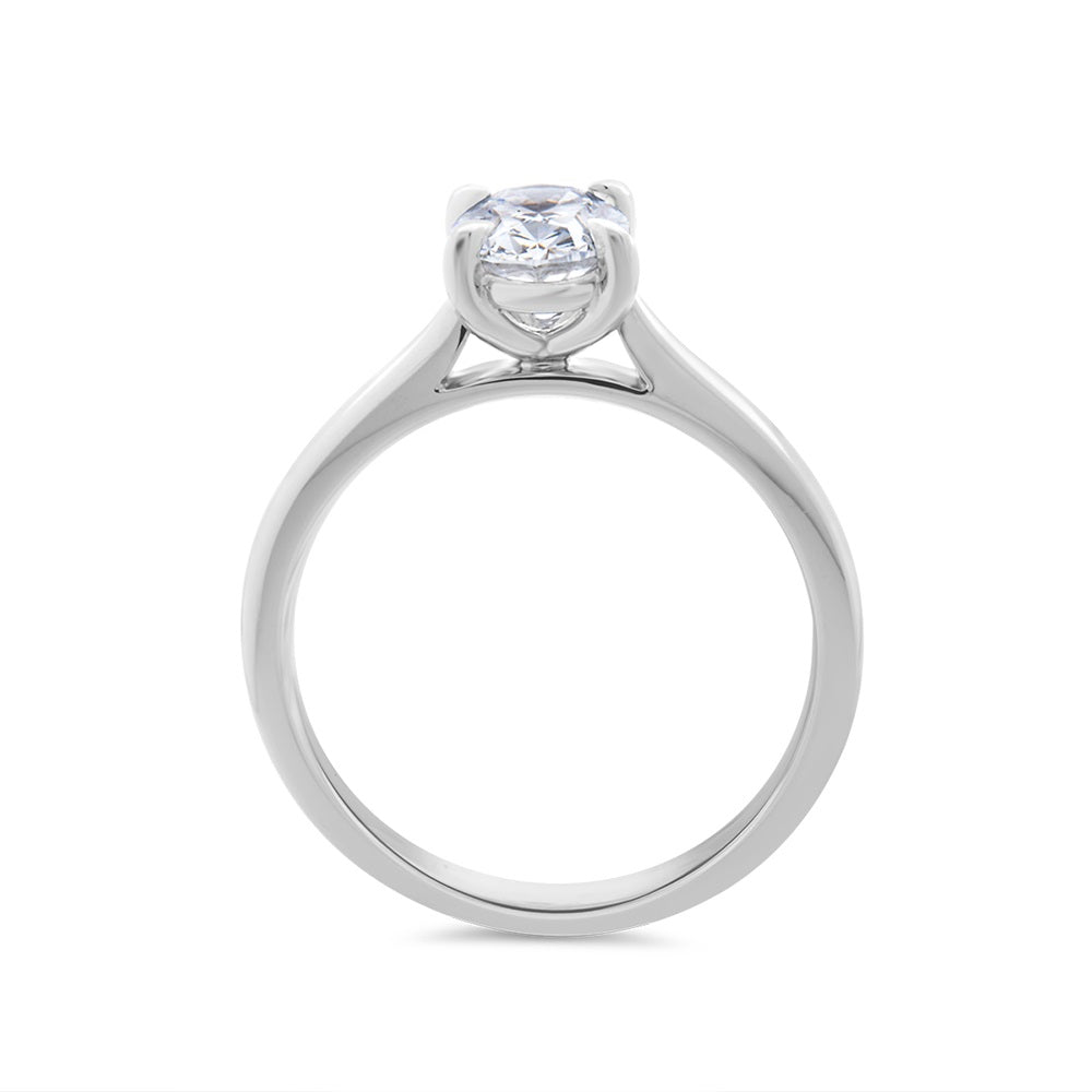 This ring is made from 18ct gold. It features a 1ct oval cut LAB GROWN diamond in a white gold four claw setting. The look of this ring is finished off with a heavier white gold band.