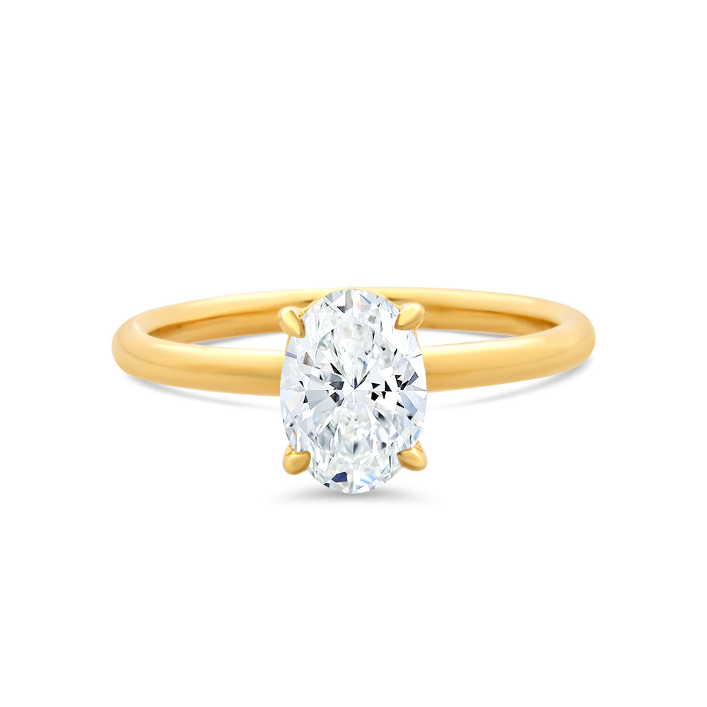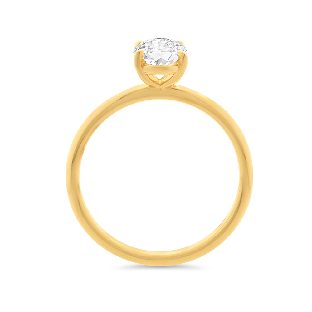 This ring is made from 18ct yellow gold. It features a 1ct oval cut LAB GROWN diamond in a four-claw setting. The look of this ring is finished off with a yellow gold band.