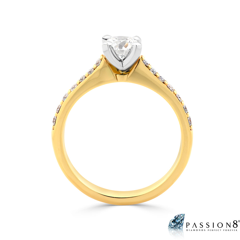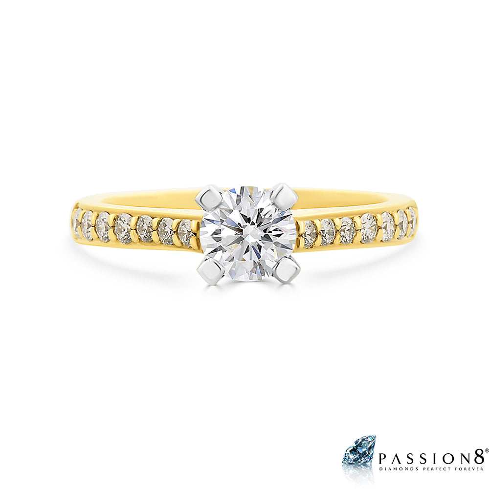 This ring is made from 18ct yellow and has a platinum setting. The centre of this ring features a 0.50CT round brilliant cut, Passion8 diamond in the centre in a 4-claw setting. The tapering shoulder stones of this ring are also round brilliant cut and bead set in yellow gold. This ring is designed to fit up against a straight ring.