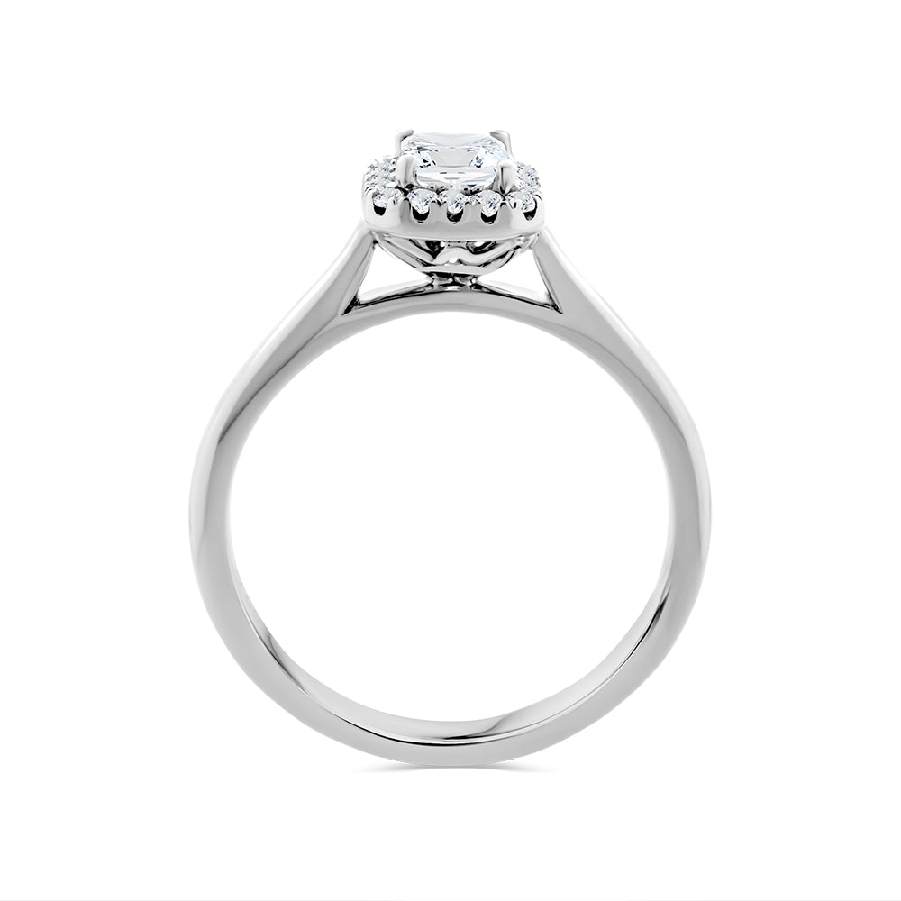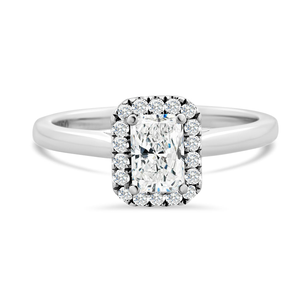 This ring is made from 18ct white gold. It features a 0.50ct radiant cut diamond in a four-claw setting that is surrounded by a halo of smaller round brilliant cut diamonds. The look of this ring is finished off with a white gold band.