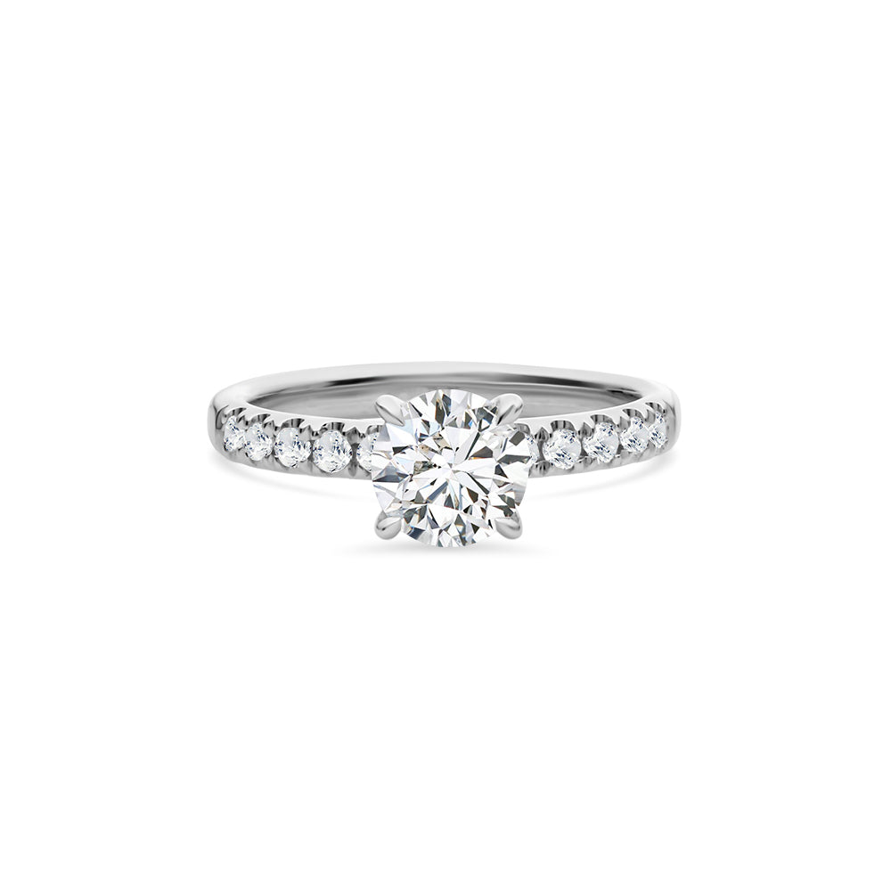 This ring is made from 18ct white gold. It features a 1ct round brilliant cut LAB GROWN diamond in a four-claw setting. The look of this ring is finished off with claw set diamond band, also made from white gold.