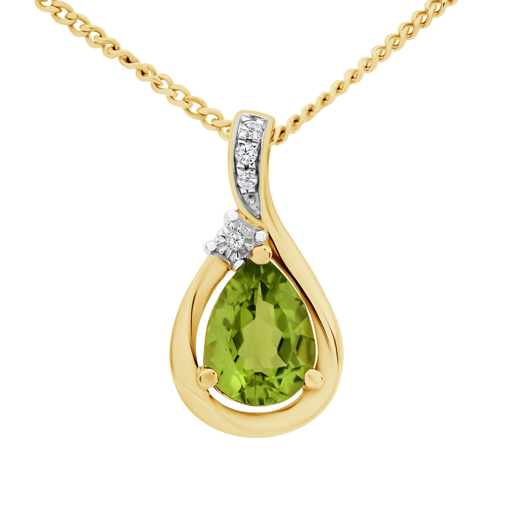 This pendant is made from 9ct yellow gold. It features a pear cut peridot in the centre framed by a gold halo with diamonds set at the top. This pendant comes on a complimentary, yellow gold-plated, display chain.