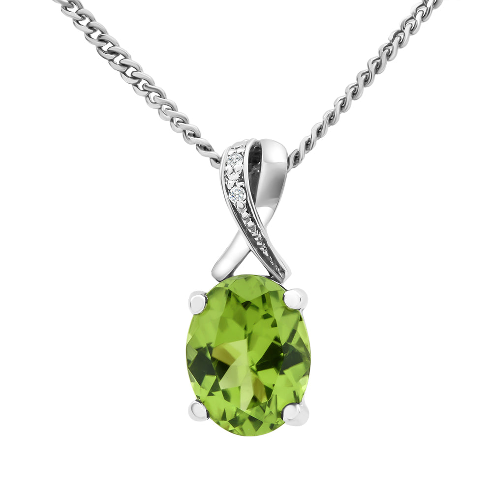 This pendant is made from 9ct white gold. It features an oval cut peridot in a claw setting in the centre with a white gold and diamond set bale. This pendant comes on a complimentary, 45cm, white gold-plated display chain.
