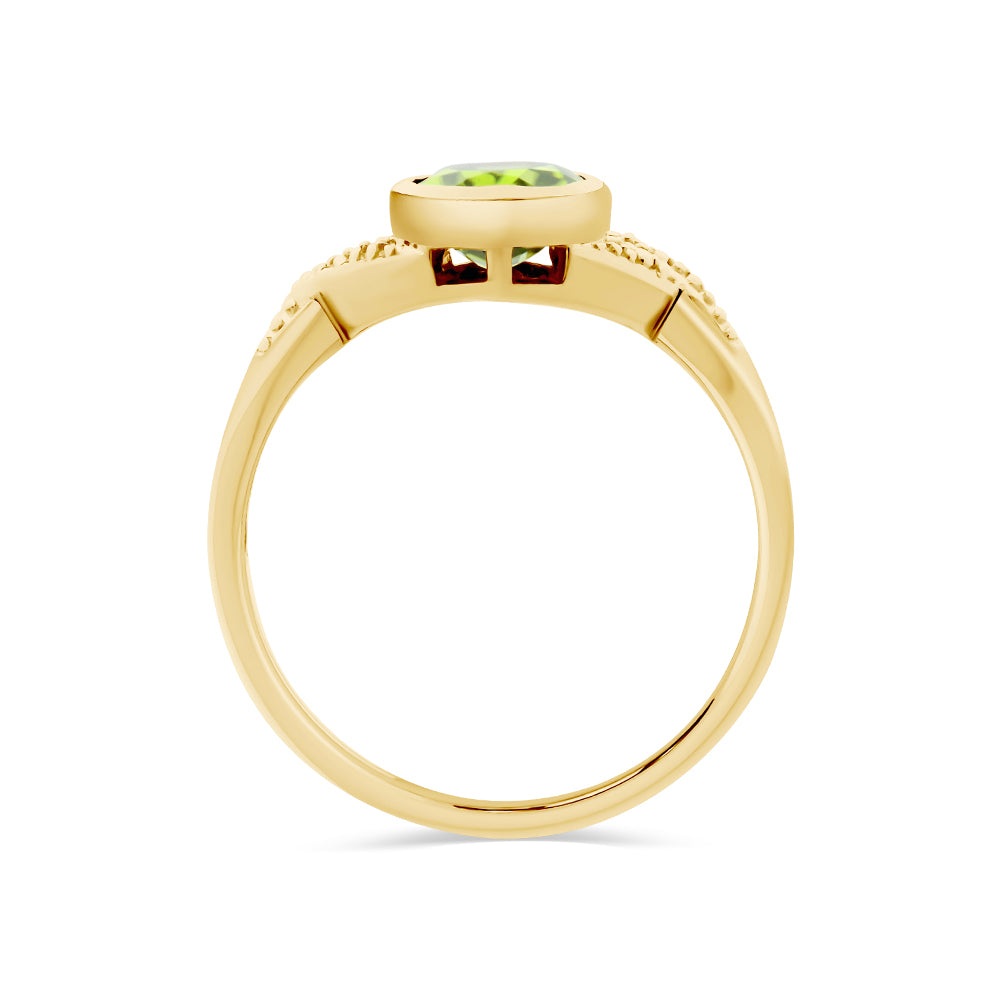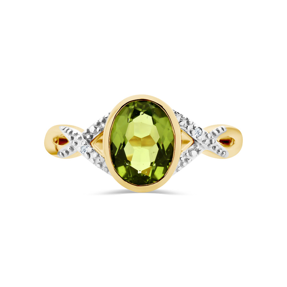 This ring is made from 9ct yellow gold. The ring features an oval cut peridot in a bezel setting. The twisted shoulders of the ring are bead set with rhodium plate while the band of the ring is yellow gold.