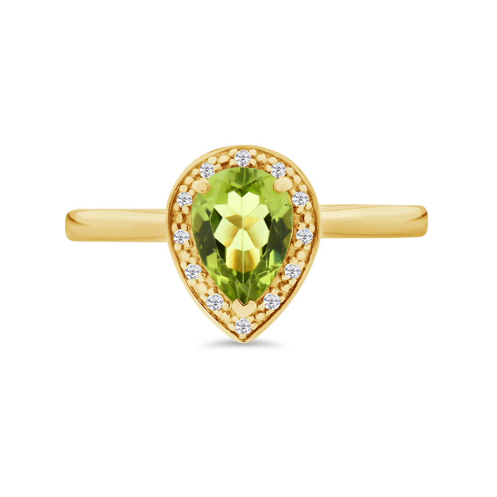 This ring is made from 9ct yellow gold. It features a pear cut peridot in the centre that is framed by a bead set halo.