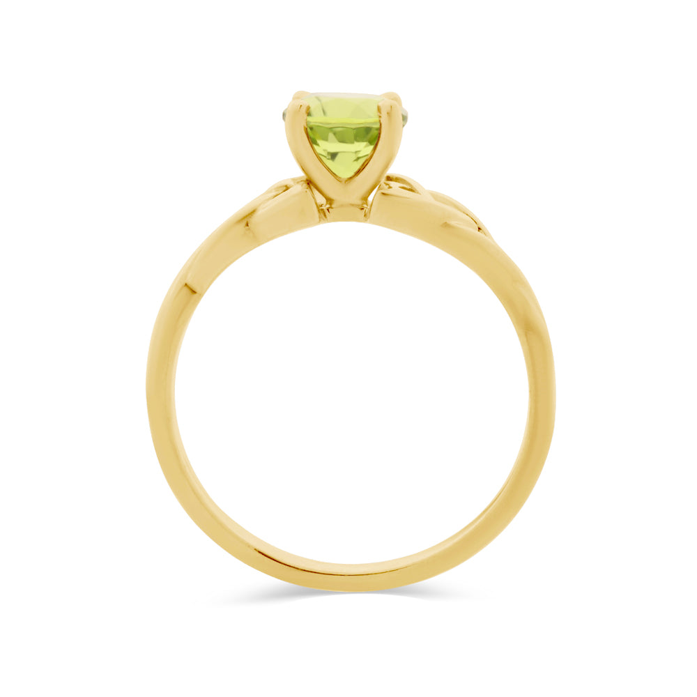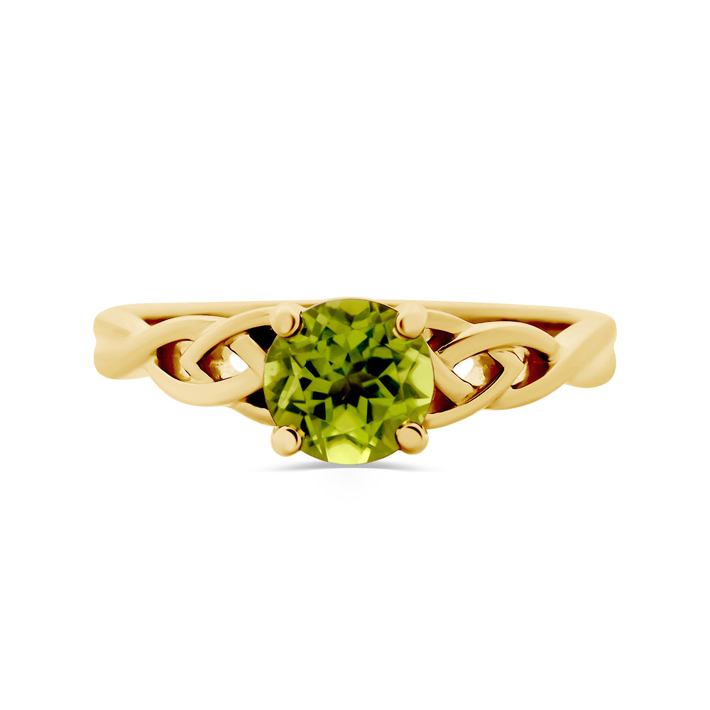 This ring is made from 9ct yellow gold. It features a round brilliant cut peridot in the centre set in a four-claw setting. The band of this ring is also made from yellow gold and features a Celtic inspired design.