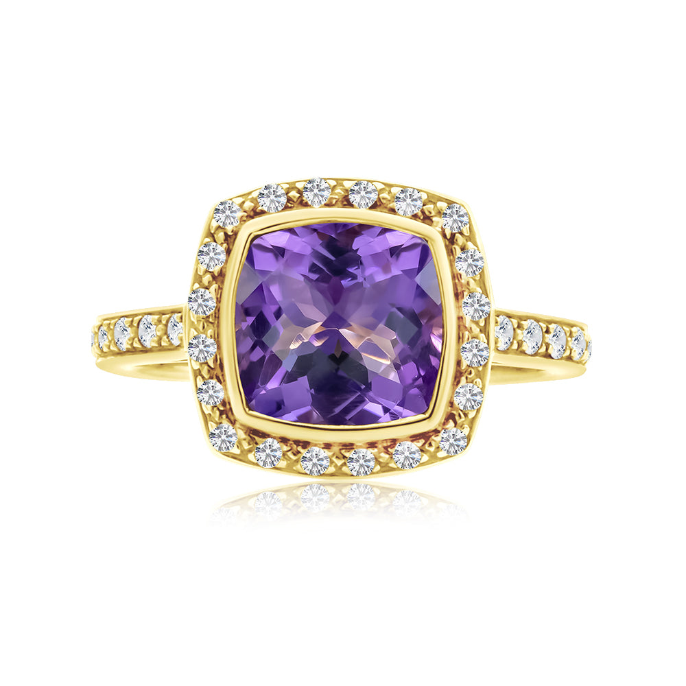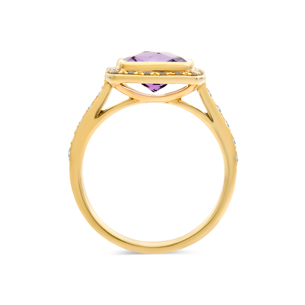This ring is made from 9ct yellow gold. It features a cushion cut amethyst with a checkerboard cut that is bezel set in the centre. This is surrounded by a halo of round brilliant cut diamonds that are also set into the band of the ring.