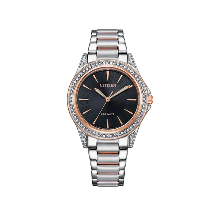 This watch features a black sunray dial with rose gold toned, luminous hands and rose gold toned markers. The case of the watch is 34mm and is made from two-tone, rose gold plate and stainless-steel. It also features a crystal set bezel and case. The look of the watch is finished off with a stainless-steel band.
