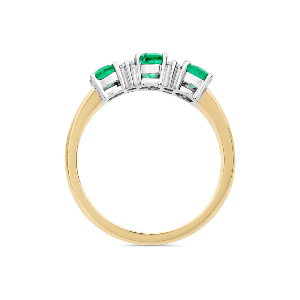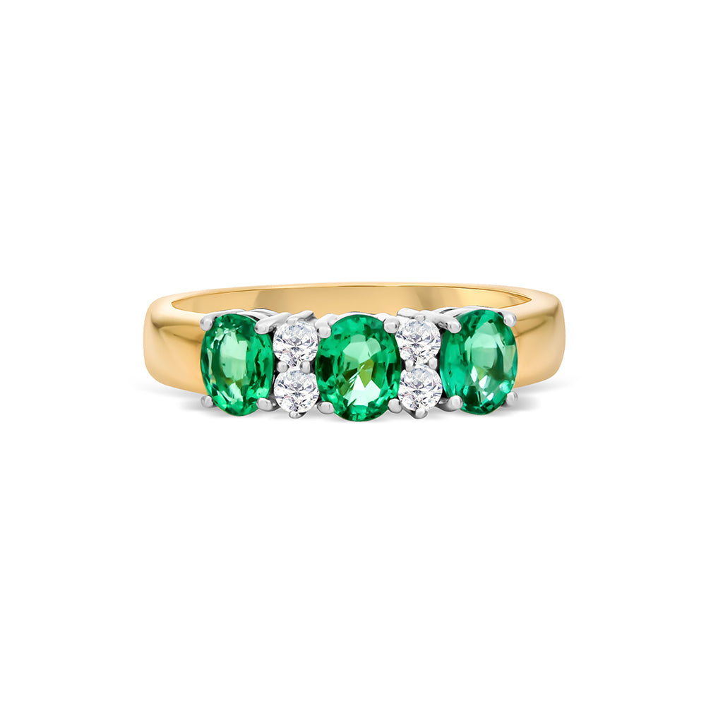 This ring is made from 18ct yellow and white gold. The ring features three oval cut emeralds that are claw set. In between each of the emeralds are two, round brilliant cut diamonds also claw set in white gold. The band of this ring is yellow gold.