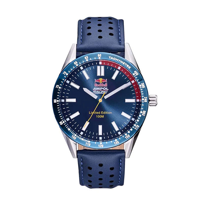 This 2024 LIMITED EDITION watch features a red bull blue dial with luminescent hands and markers with blue, yellow and red highlights as well as the iconic 'Red Bull Ampol' racing symbol. The case of the watch measures 44mm, it is made from stainless-steel with a blue rotating bezel that features a tachymeter, while the case back is engraved with its limited edition number out of 100 (please note that serial number selection is not possible and may vary from pictures). The look of the watch is finished off with a blue leather band. This watch comes in a presentation box