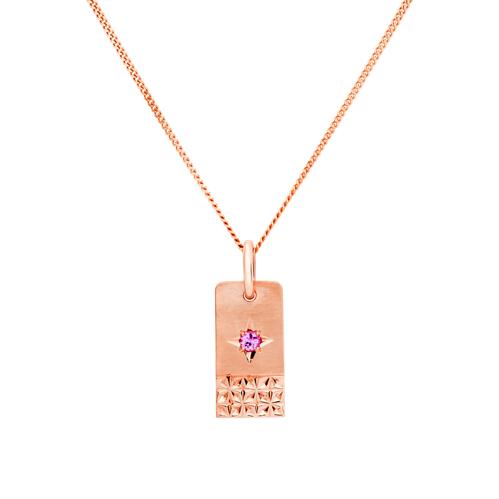 Handmade in our onsite workshop this 21x11mm rectangular pendant is made from 9ct rose gold. It features a pink sapphire in the centre that is star set. The look of the pendant is finished off with brushed finish on top and and engraved art deco design at the bottom. This pendant comes on a complimentary, 45cm rose gold display chain.