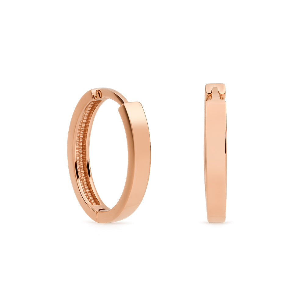 These earrings are made from 9ct rose gold. Each one features a square profile in an oval shape, measuring approximately 16x13mm. These earrings have a huggie fitting.