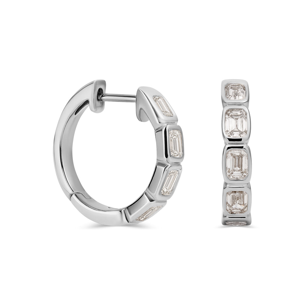 There earrings are made from 9ct white gold. Each one features five, emerald cut LAB GROWN diamonds that are bezel set on the front of the earrings. These earrings are approximately 17mm in diameter and have a huggie fitting.