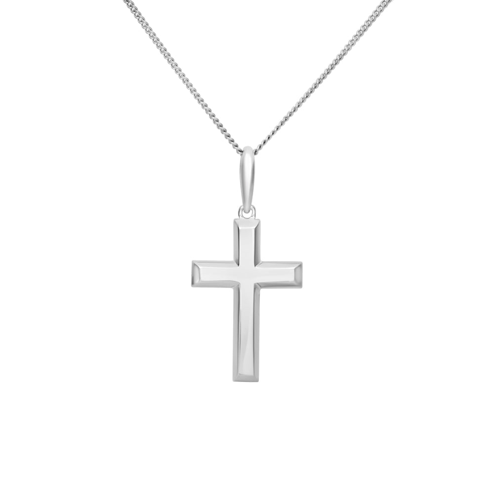 This necklace is made from 9ct white gold. It features a cross design with a bevelled edge and measures approximately 25 x 17mm. The necklace comes on a complimentary, 45cm, white gold plated display chain.