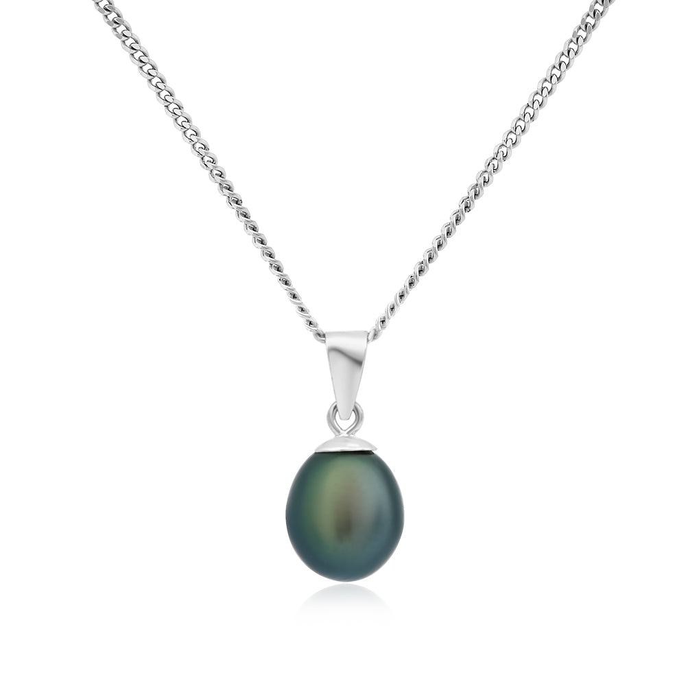 JULIEANNE: This pendant is made from 9ct white gold. It features an oval 7.5-8mm, dyed black, oval, freshwater pearl with a white gold bale. This pendant comes on a 45cm, white gold plated display chain.