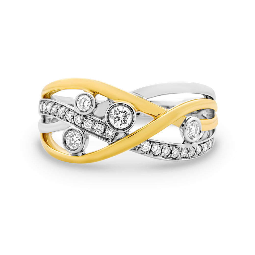 This ring is made from 9ct yellow and white gold. It features 4 randomly placed round brilliant cut diamonds bezel set in white gold. The ring also features 19 smaller, round brilliant cut diamonds bead set in white gold. The remainder of the twisted design of the ring is made up of one white gold arm and shank with two yellow gold arms.