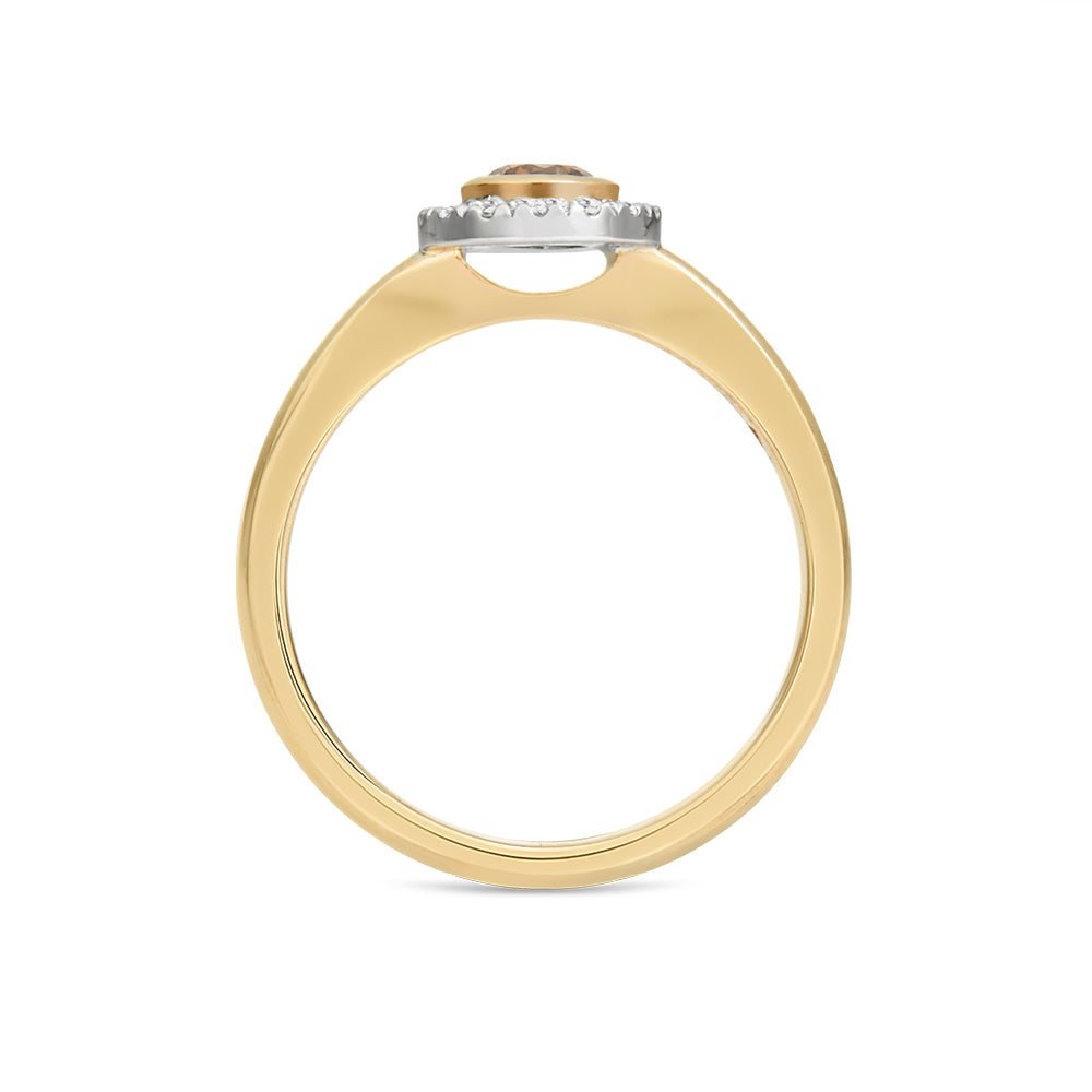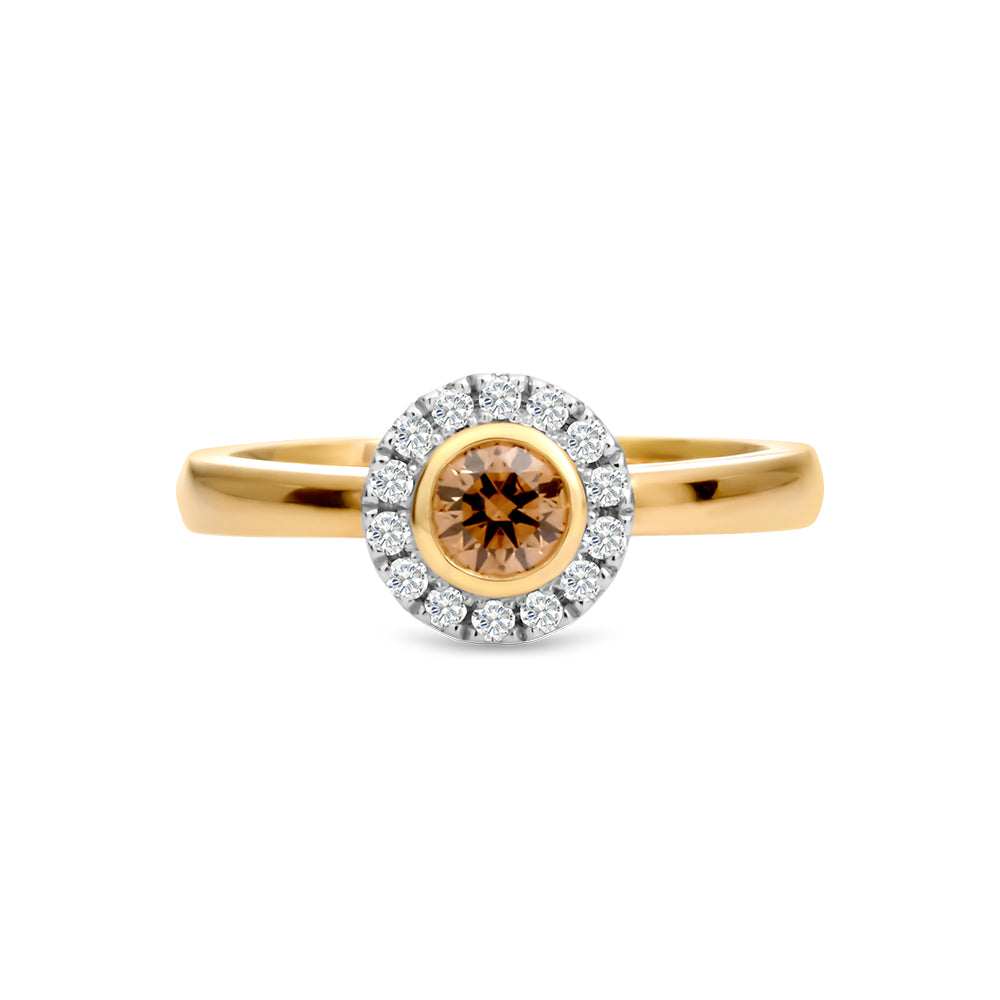 This ring is made from 9ct yellow and white gold. It features a round brilliant cut, Australian chocolate diamond that is bezel set in yellow gold and surrounded by a halo of round brilliant cut, white diamonds that are claw set in white gold. The look of this ring is finished off with a yellow gold band.