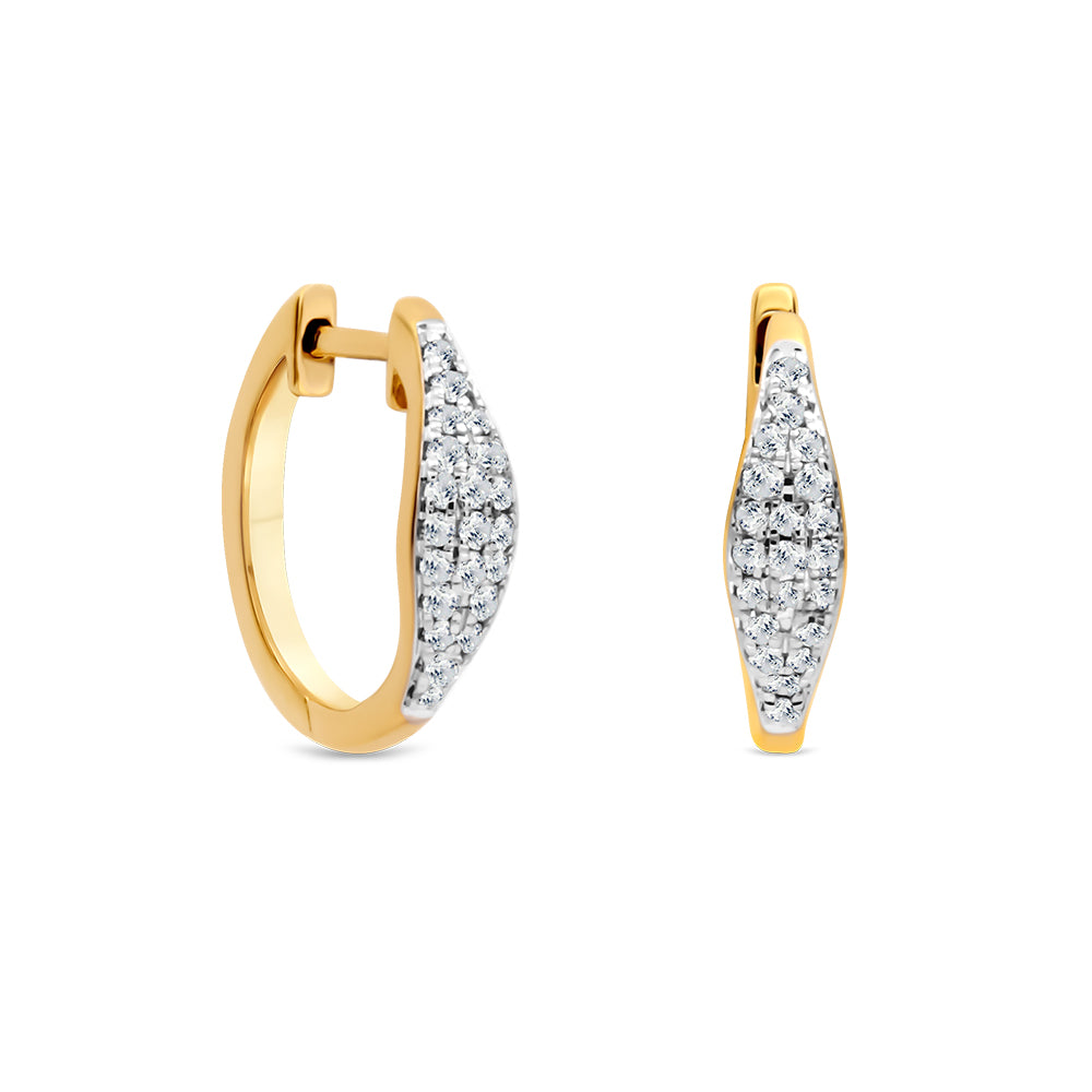 These earrings are made from 9ct yellow gold. Each one features round brilliant cut diamond that are in a rhodium plated, bead setting in a slight domed pattern in the centre. These earrings measure approximately 12mm and have a huggie fitting.