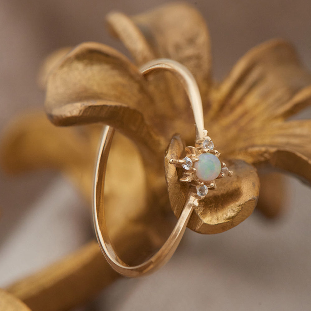 This exquisite 14ct gold ring features a 2.5mm opal at its centre, surrounded by four 1.1mm white sapphires arranged in a sparkling star design. With a delicate 1.1mm band, it’s a perfect blend of elegance and celestial charm.