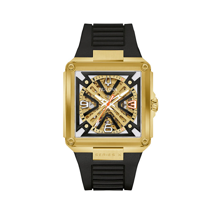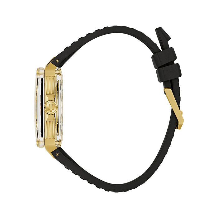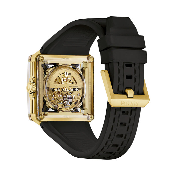 MARC ANTHONY LIMITED EDITION: This limited edition watch is a stunning tribute to Bulova's 150 years of mastering the craft of luxury watchmaking. The focus of the watch is a skeleton dial with white, red, black and yellow gold toned features and highlights, with super luminous fill. The 39mm case of the watch is yellow gold ion plated on stainless-steel and fixed between sapphire crystal glass, both top and bottom with the limited edition serial number engraved on the case back. The look of this watch is finished off with a black silicone band. This watch is limited edition to 600 pieces world wide. This watch comes in a presentation box with an information booklet and display card.