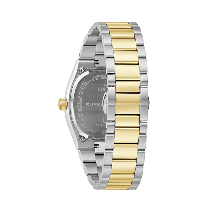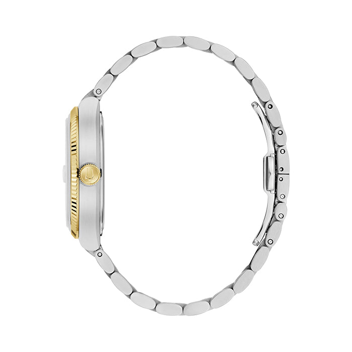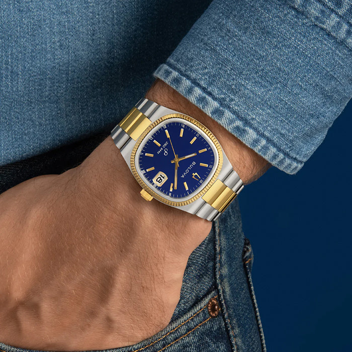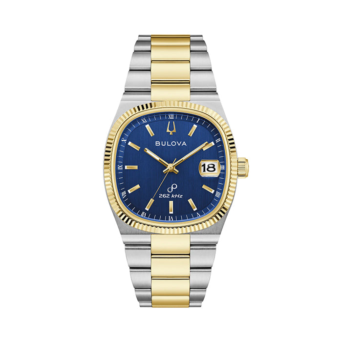This watch features a blue toned dial with gold toned hands and features, including a date window and all protected by sapphire crystal glass. The 37mm tv shaped case of the watch features a coin edge bezel and is made from combination yellow gold plating and stainless-steel, as is the matching band.